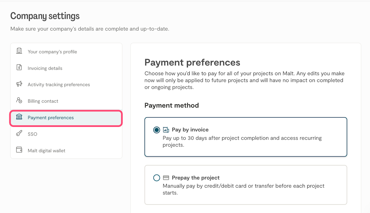 By default, your business is set to prepay. You can switch to invoice payment when preparing a project. To do this, select the “Payment by invoice” option and complete the required information. In order to benefit from the invoice payment method, you must have completed a first project on Malt and your company must be eligible for the cash advance.