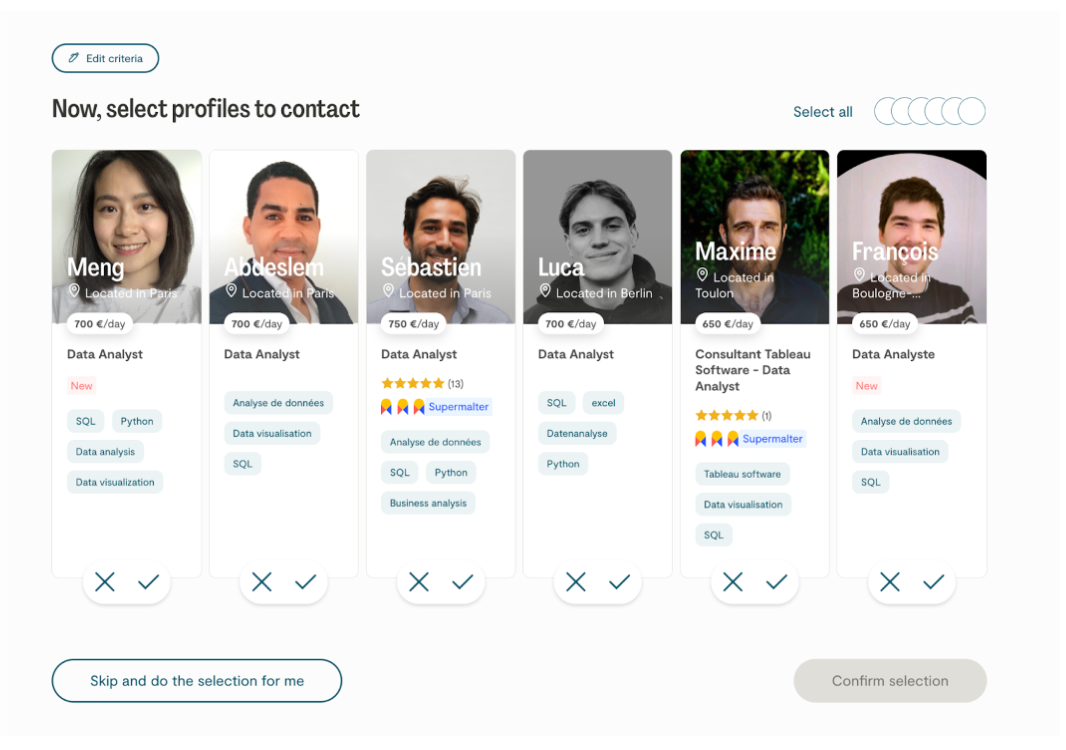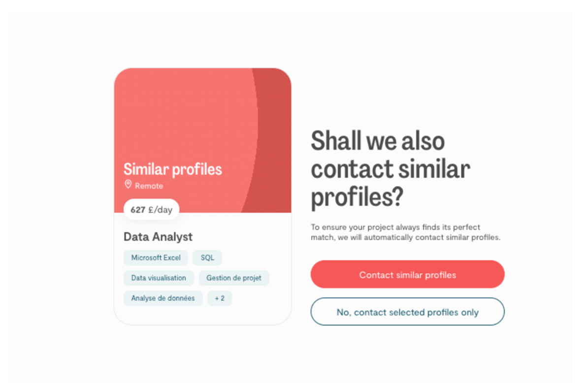 Once you have confirmed your selection, we will ask you if our algorithm should automatically contact similar profiles to the ones you have selected. This will make the pool of potential candidates bigger.