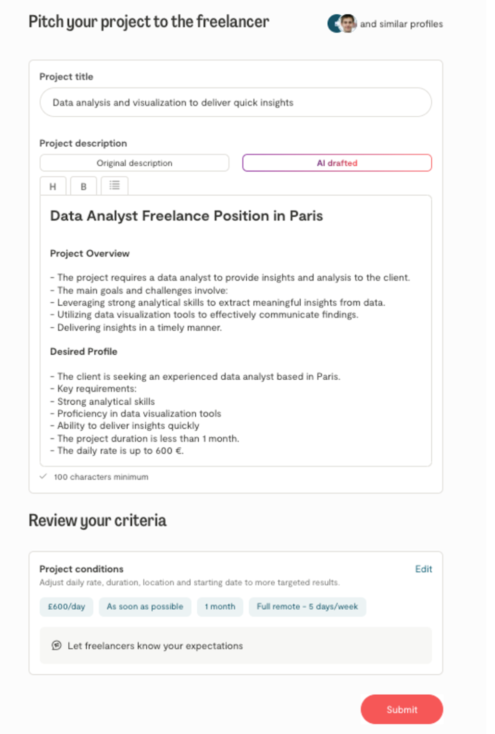 Based on your project description, our AI has drafted a detailed brief which will be sent to freelancers. Now you can review and edit it as you need. If you prefer, you can keep your original brief.