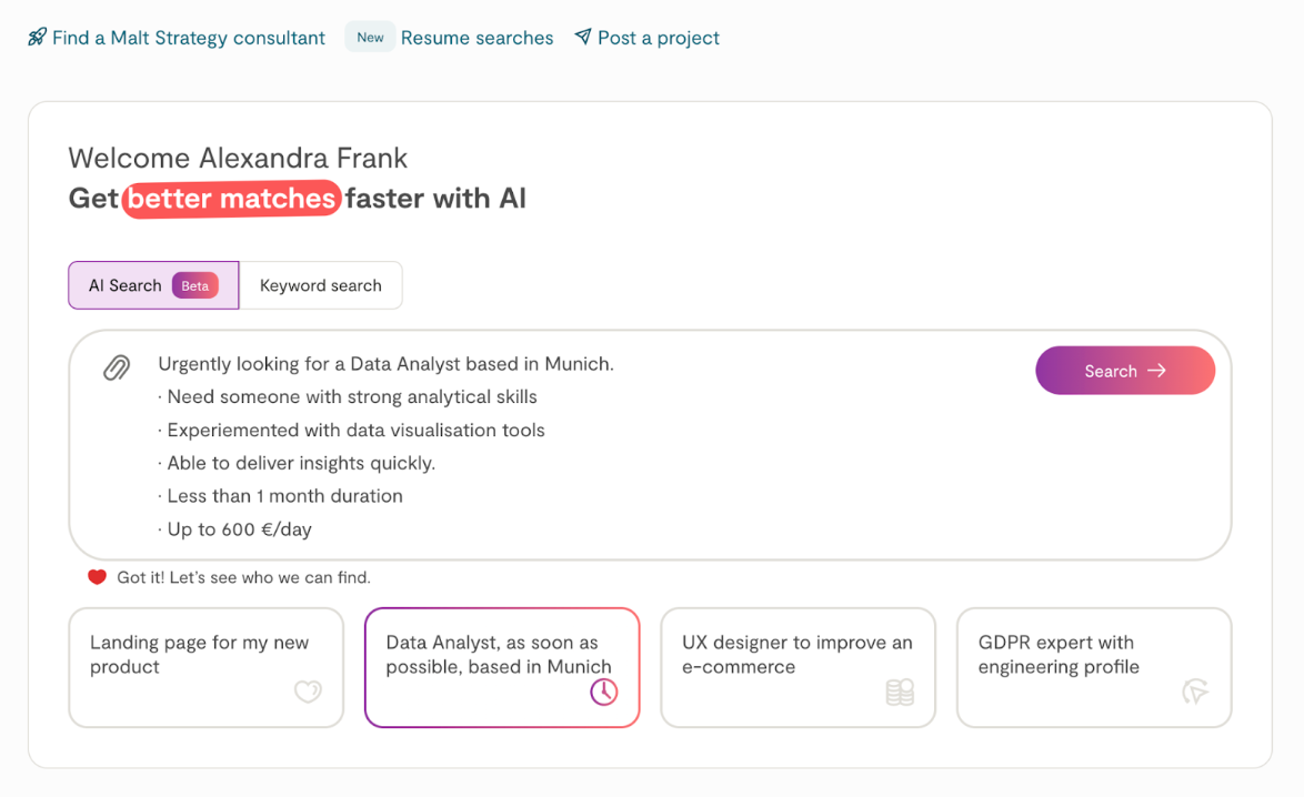On Malt, you can manually search for matching freelancers via the keyword search.