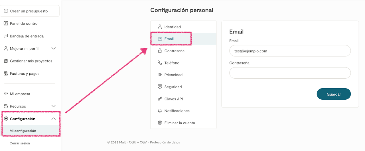 To modify the email associated with your Malt account, you must go to your account settings > Email section.