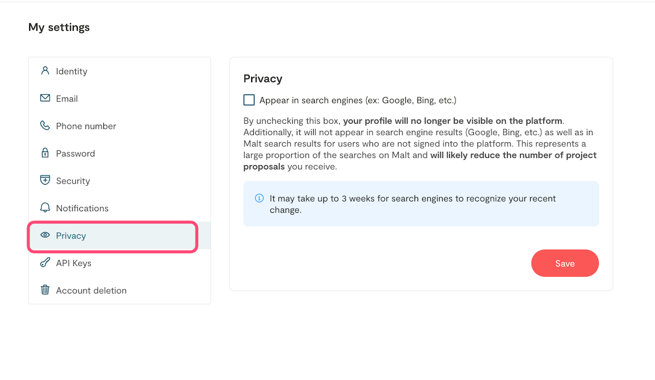 To stop appearing in search engines, go to "Settings" > click on the "Privacy" section and deactivate the option.