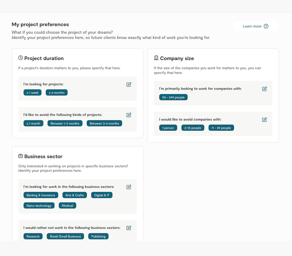 The project preferences are there to allow you to proclaim loud and clear the projects that interest you. We take care of making them visible to customers so that you can receive proposals that best meet your criteria: