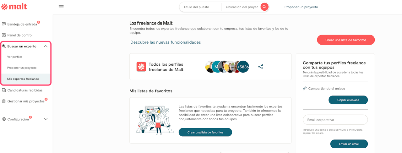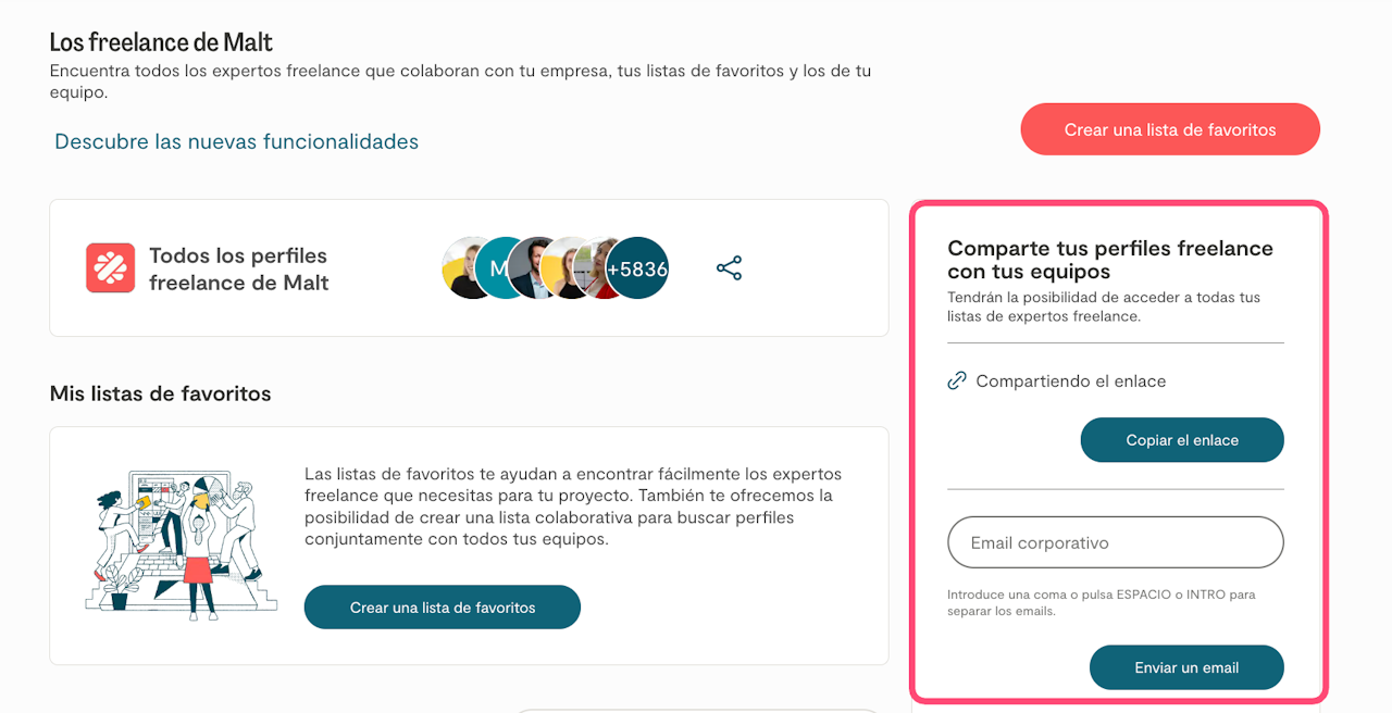 Con Malt, puedes ver a los freelancers que ya han trabajado para tu empresa o que vienen recomendados por tus compañeros. Como usuario de una cuenta de empresa, ahora puedes ver a todos los freelancers de tu empresa: los que trabajan con tus compañeros (a través de Malt o no) así como los freelancers que ellos han añadido a sus favoritos.