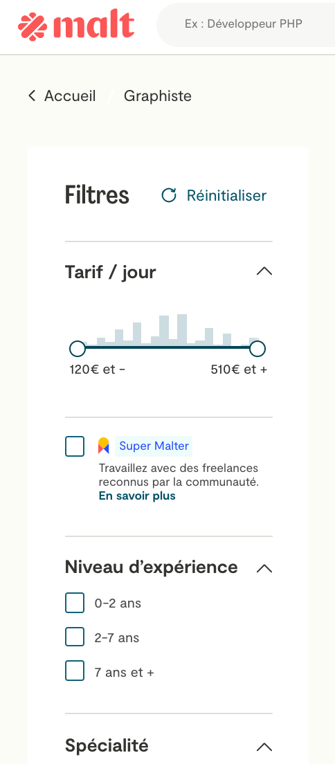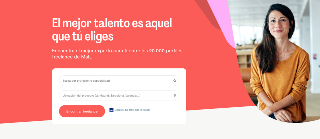 - En el buscador de la página de inicio de Malt, escribe el título del puesto que necesites o la especialidad que estás buscando, así como la ciudad o región y click en “buscar”.