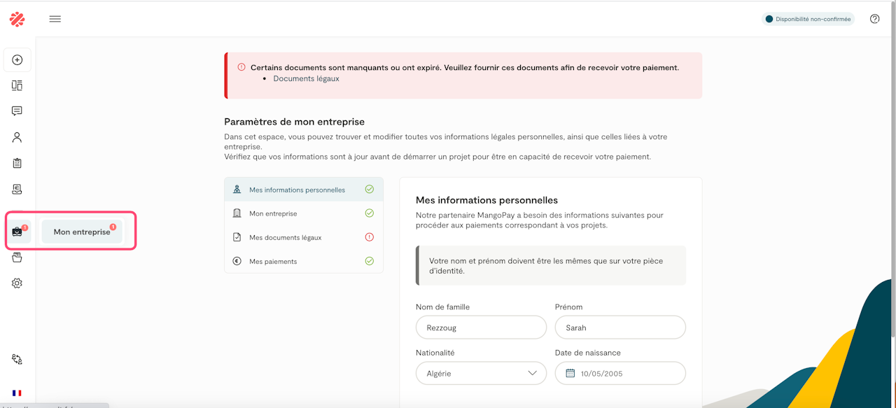 Afin de réaliser des projets et de recevoir des paiements, vous devez vous inscrire auprès de Malt et compléter toutes vos informations légales.