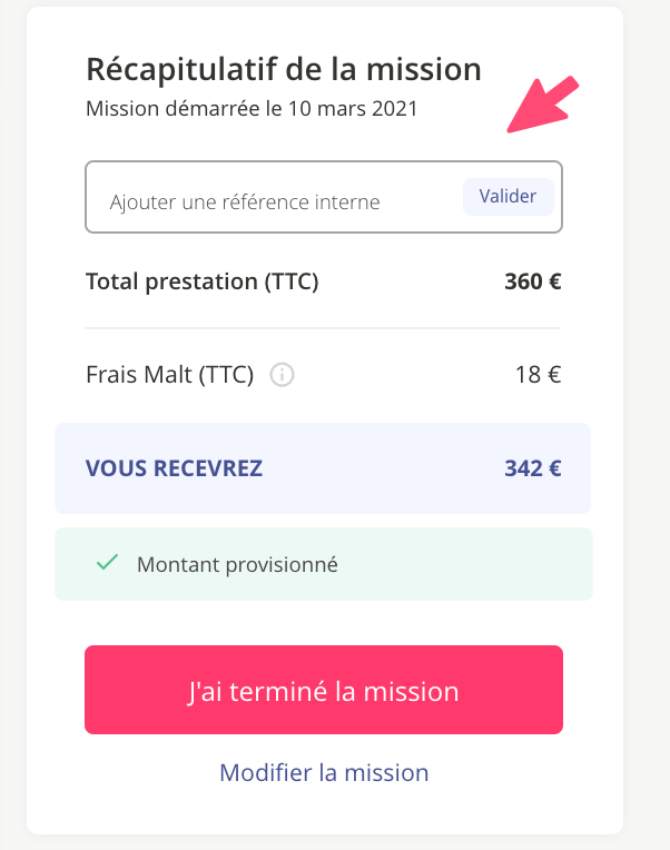 Lorsque vous terminez une mission , vous pouvez voir en haut à gauche une "référence interne", vous pouvez indiquer ici le numéro de référence de votre système de comptabilité interne si vous le souhaitez pour que votre comptable ne passe pas des heures à comprendre comment gérer vos factures émises par Malt.