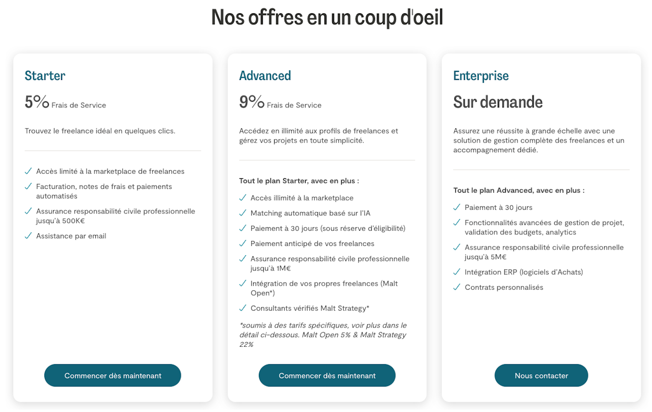 💡 Ces offres sont facturées sous la forme de frais de service sur chaque mission que les freelances réalisent à travers Malt.
