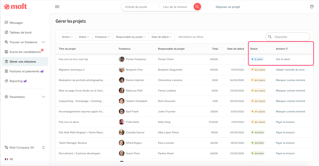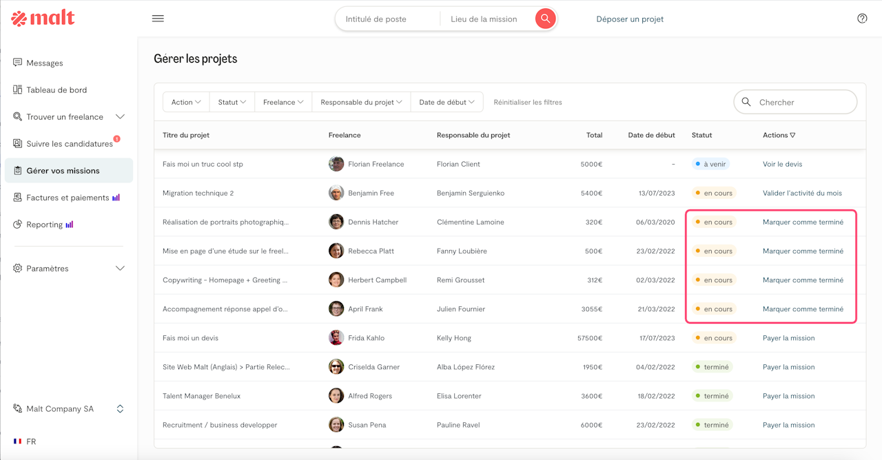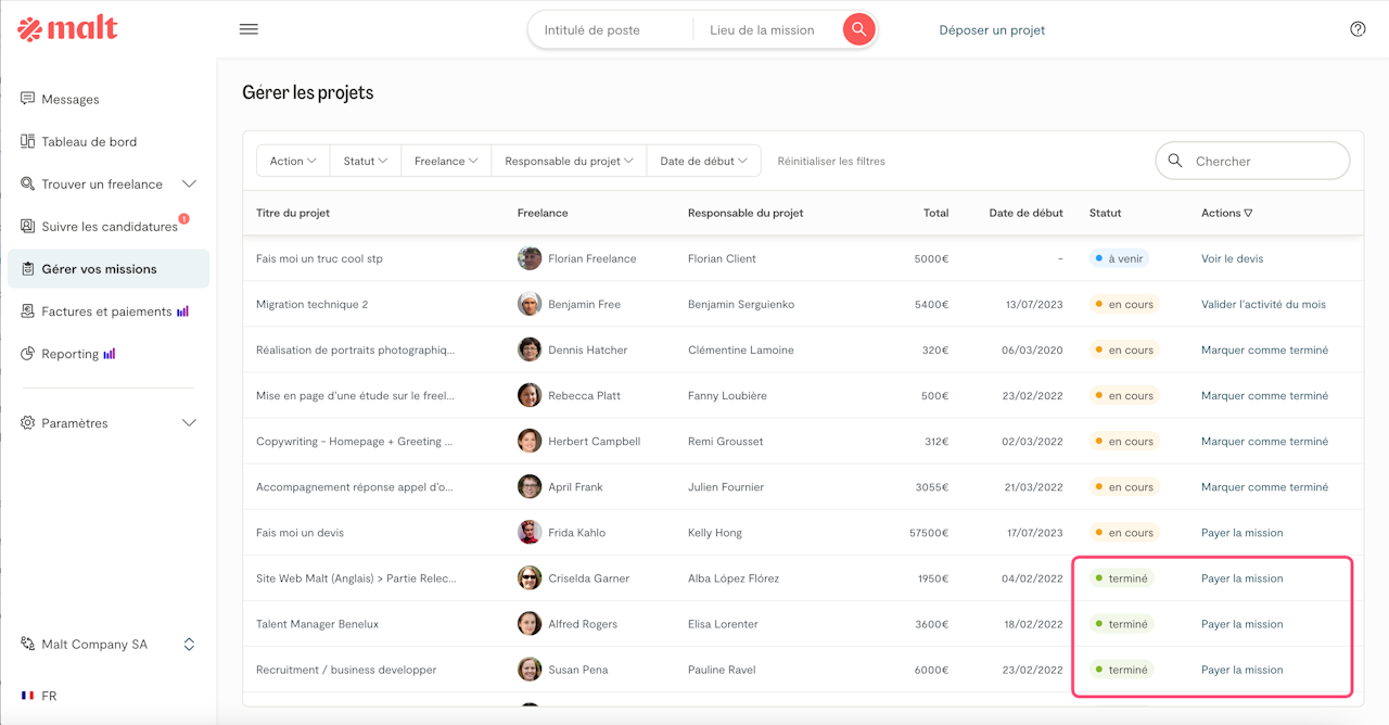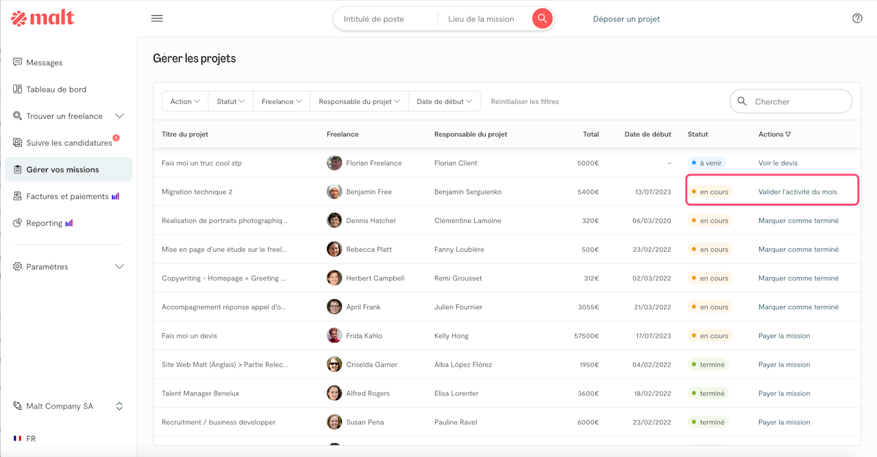 Une fois que le travail du freelance a été rendu, le freelance pourra indiquer la fin du projet et vous pourrez ensuite valider la fin du projet, ce qui déclenchera le paiement de la mission.