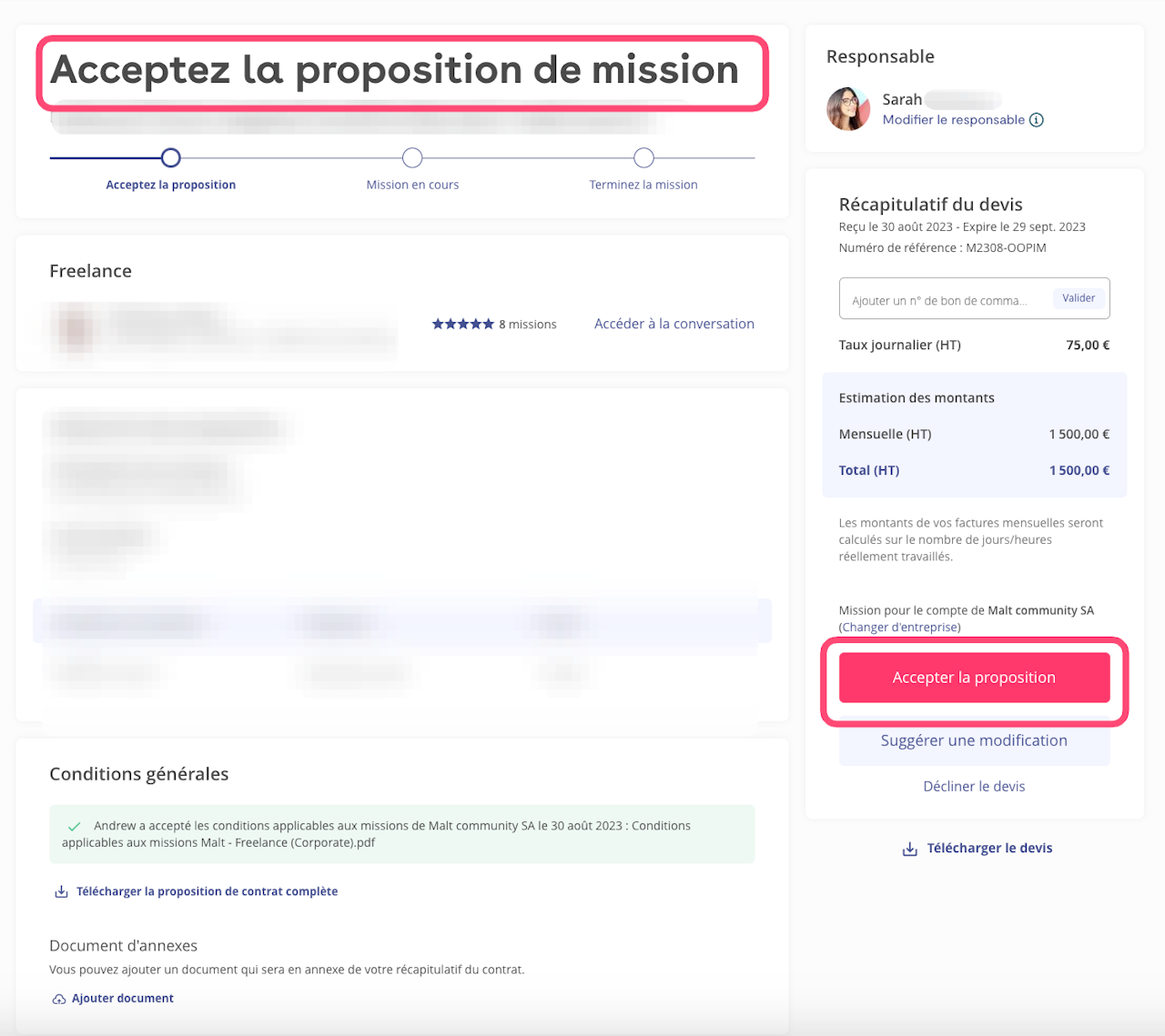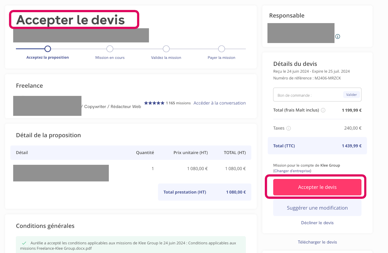 Pour accepter un devis d’un freelance, il suffit de cliquer sur “accepter le devis”.