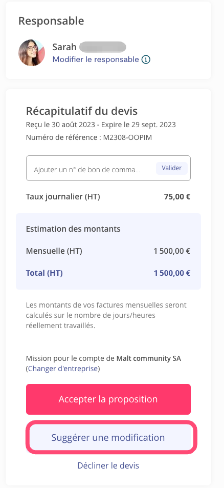 Lorsque vous souhaitez contractualiser avec un freelance contacté sur Malt, le devis doit être créé et validé via notre plateforme.