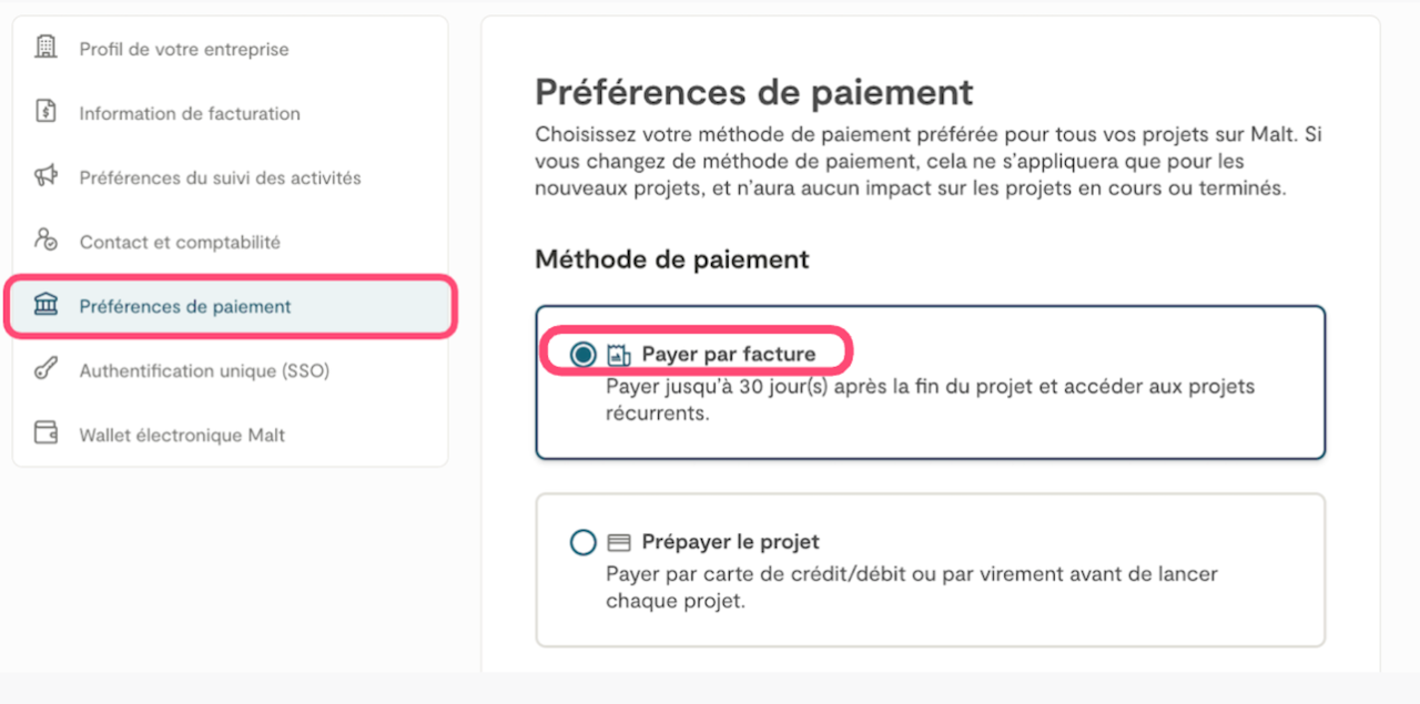 Vos conditions de paiement dépendent de votre accord avec Malt, et vous pouvez trouver ces détails sur vos factures.