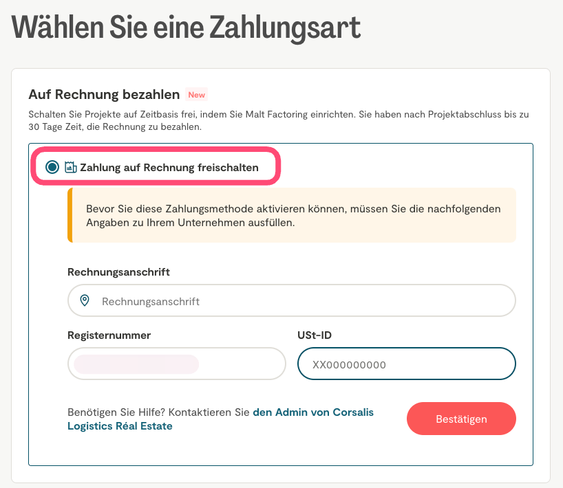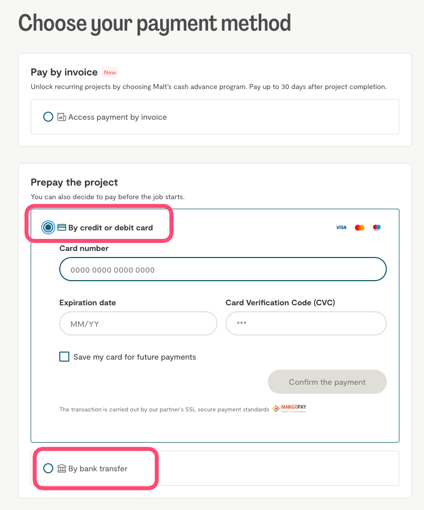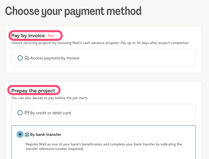 Je bedrijf is standaard ingesteld op vooraf betalen. Bij het voorbereiden van een project kun je overstappen op factuurbetaling. Hiervoor selecteer je de optie 'Betalen op factuur' en vul je de gevraagde gegevens in. Om te kunnen profiteren van de betalingsmethode voor facturen, moet je een eerste missie op Malt hebben voltooid en moet je bedrijf in aanmerking komen voor het contante voorschot.