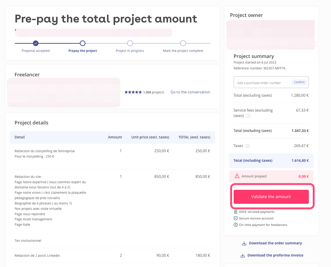 Vooruitbetalen betekent dat u het project betaalt voordat het begint. We raden aan om vooraf te betalen om de freelancer vertrouwen te geven en het project soepel te laten starten.