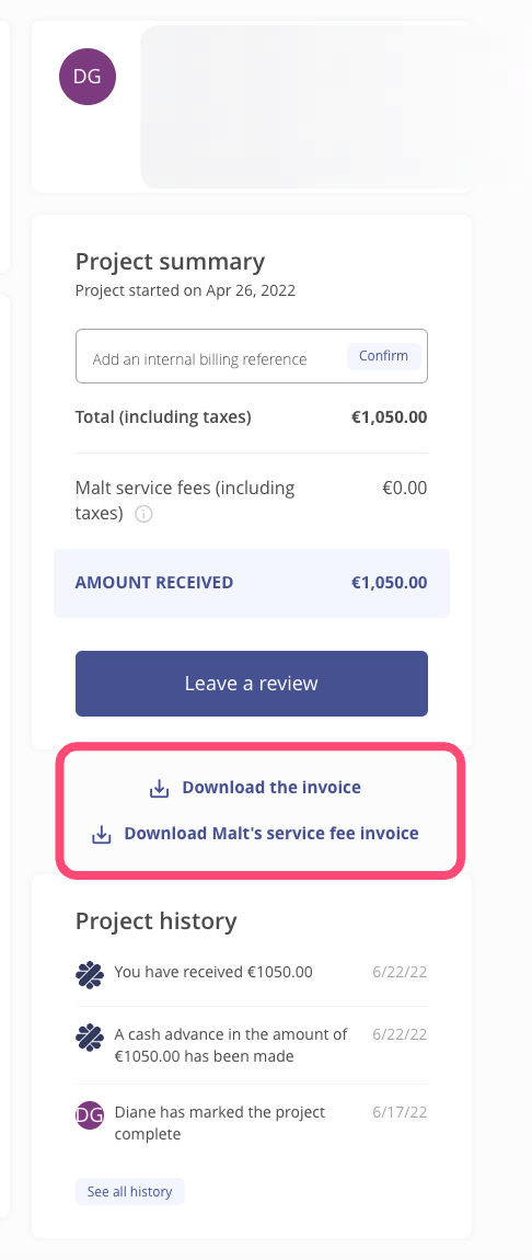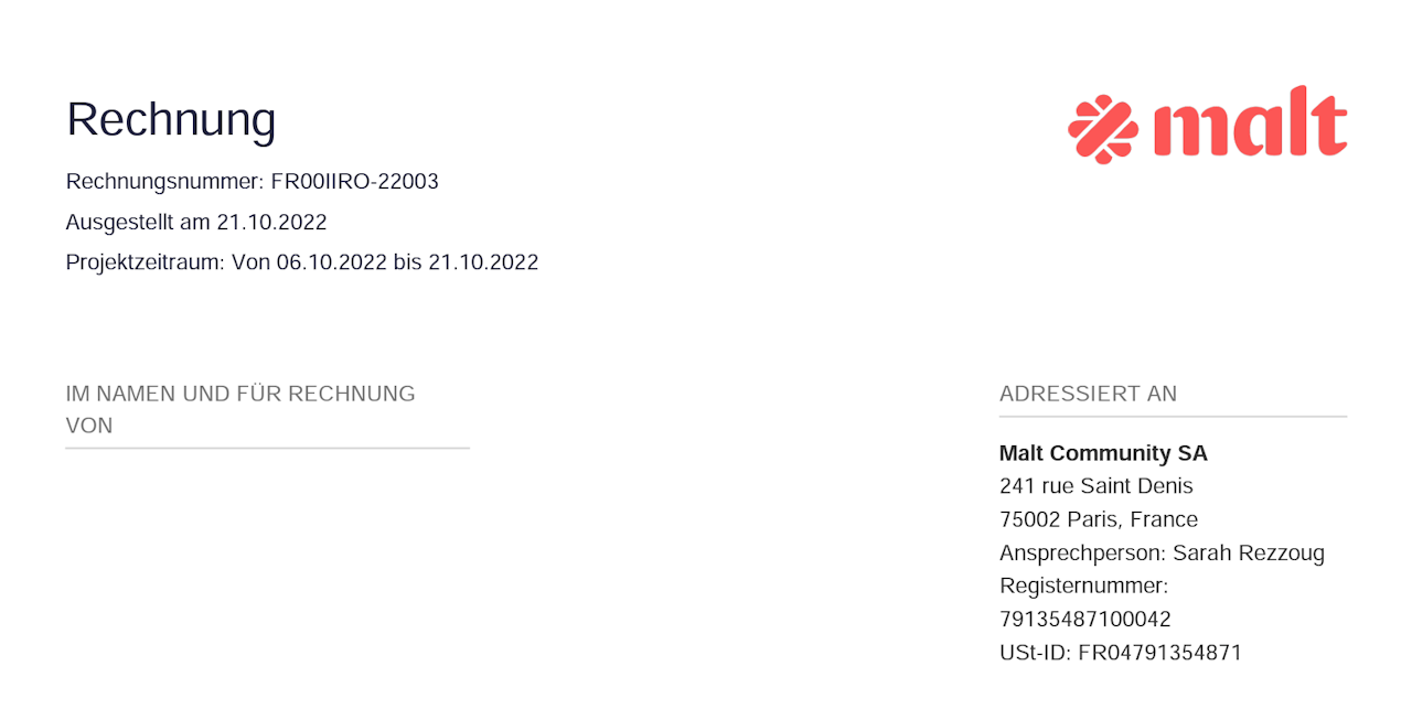 Deze documenten hebben een gestandaardiseerde Malt-header en bevatten dus zowel de factuurgegevens van de freelancer als die van uw bedrijf.