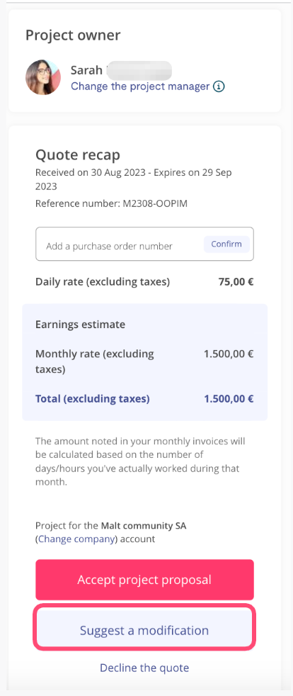 Om het project in overleg met de freelancer te wijzigen, kunt u contact opnemen met het ondersteuningsteam: support@malt.com