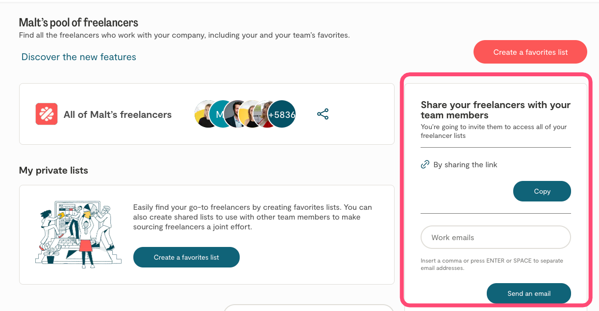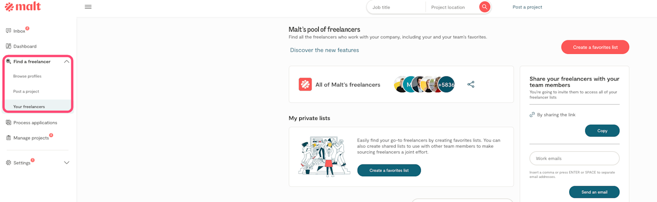 Met Malt kunt u freelancers bekijken die al voor uw bedrijf hebben gewerkt of die door uw collega's zijn aanbevolen. Als gebruiker van een bedrijfsaccount kunt u nu alle freelancers in uw bedrijf zien: degenen die met uw collega's werken (via Malt of niet) en freelancers die ze aan hun favorieten hebben toegevoegd.