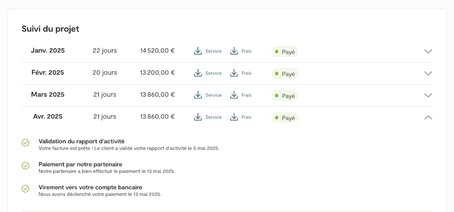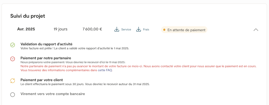 Det gir deg mulighet til å få betalt innen 10 virkedager fra datoen for validering av oppdraget ditt eller den siste aktivitetsrapporten som er validert av klienten din, samtidig som klienten har muligheten til å betale senere, underlagt kvalifikasjonsvilkår .
