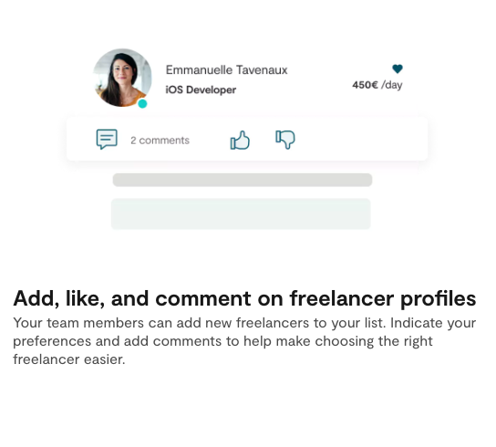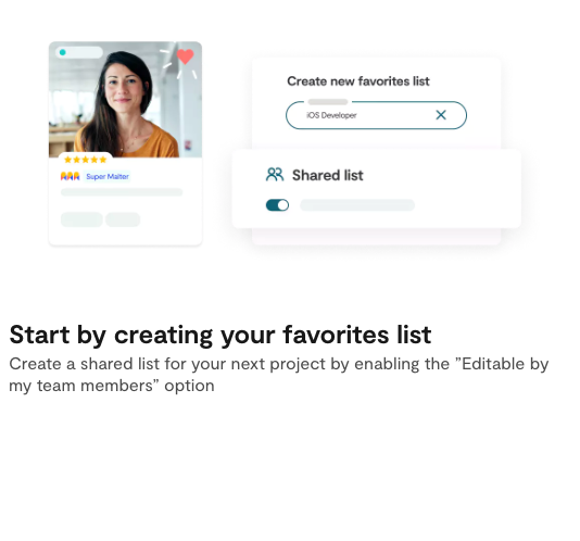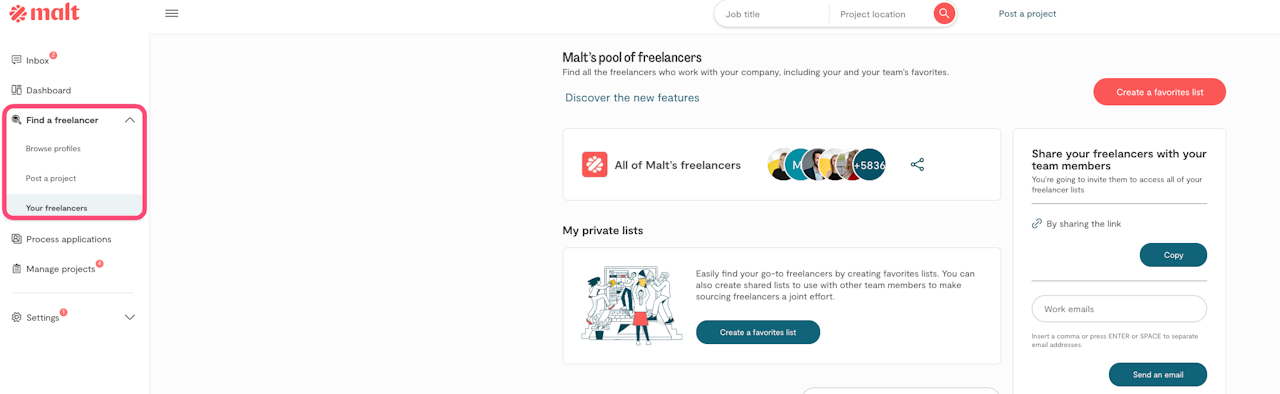 Med Malt kan du se frilansere som allerede har jobbet for din bedrift eller som kommer anbefalt av kollegene dine. Som bruker av en firmakonto kan du nå se alle frilanserne i bedriften din: de som jobber med kollegene dine (gjennom Malt eller ikke) samt frilansere som de har lagt til i favorittene sine.